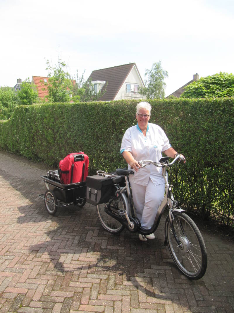 Bij mooi weer kon u mij (vóór de Corona-crisis) in Ferwert op de fiets tegenkomen: met de pedicurekoffer en -tas in de aanhanger